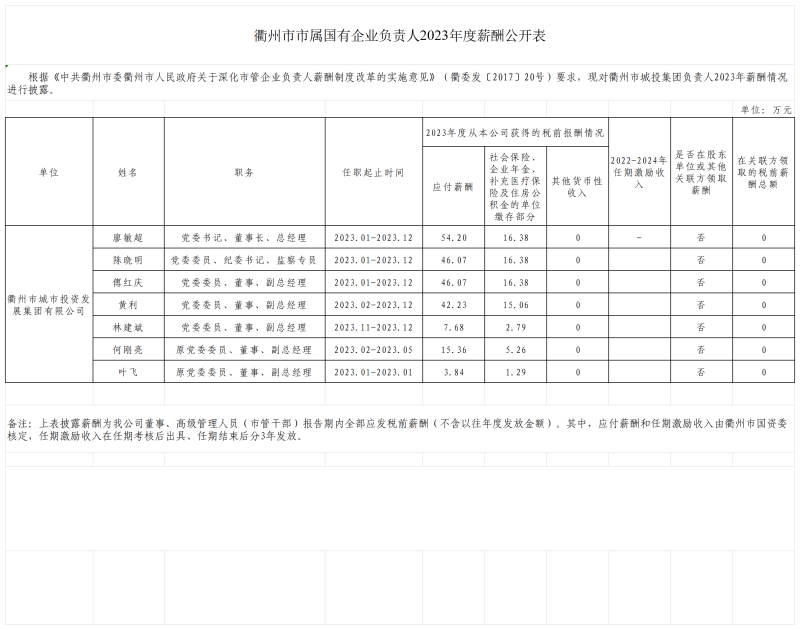 衢州市市属国有企业负责人2023年度薪酬公开表