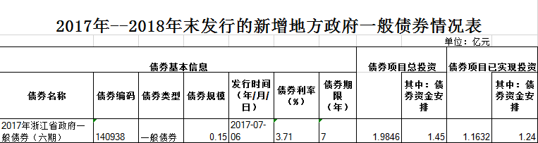 衢州市城市建设投资集团有限公司2017年--2018年末发行的新增地方政府一般债券情况表