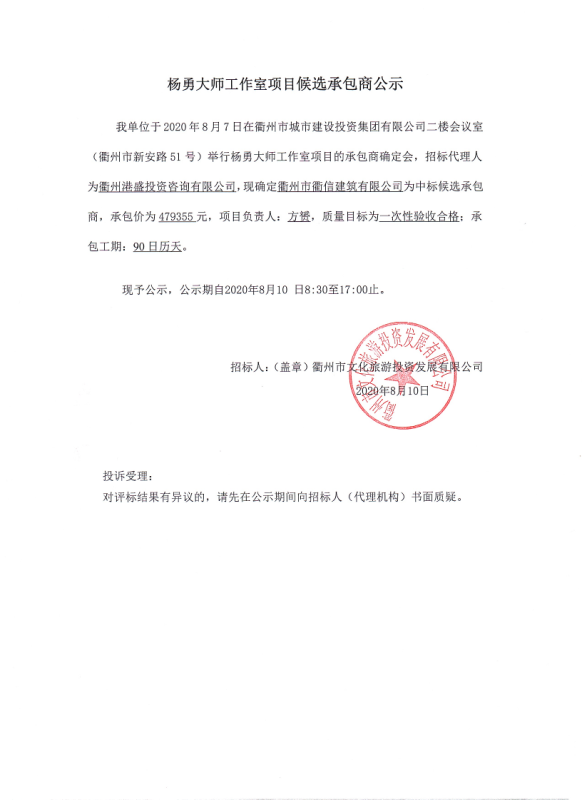 杨勇大师工作室项目候选承包商公示