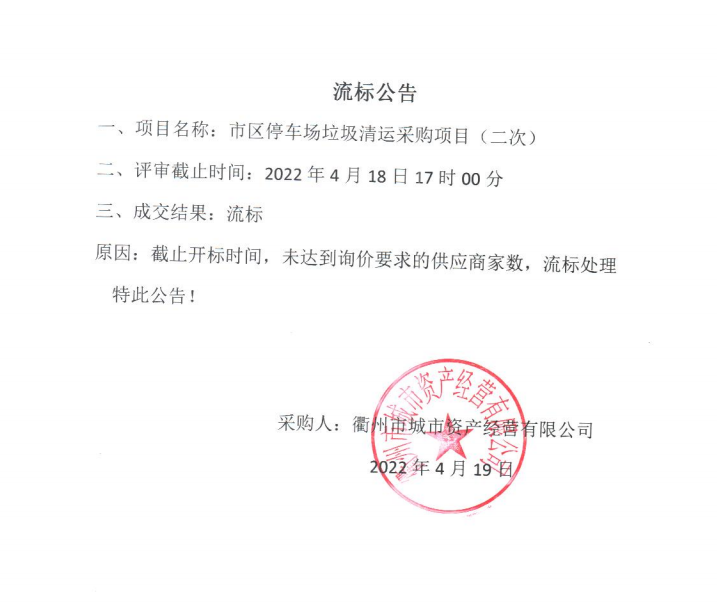 市区停车场垃圾清运采购项目(二次)流标公告