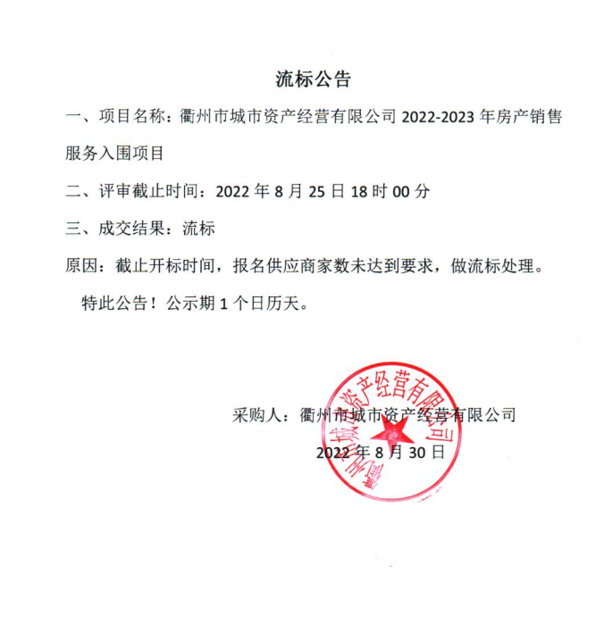 衢州市城市资产经营有限公司2022-2023年房产销售服务入围项目流标公告