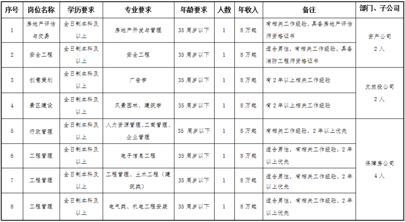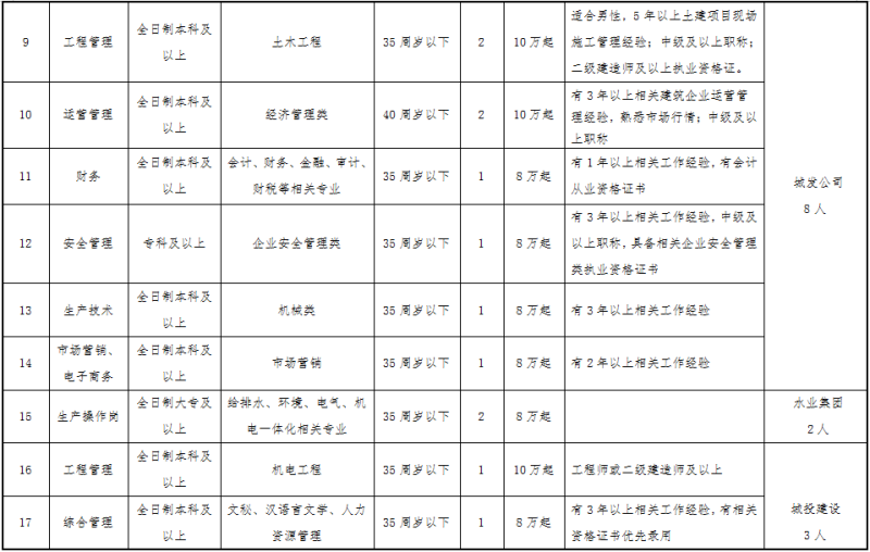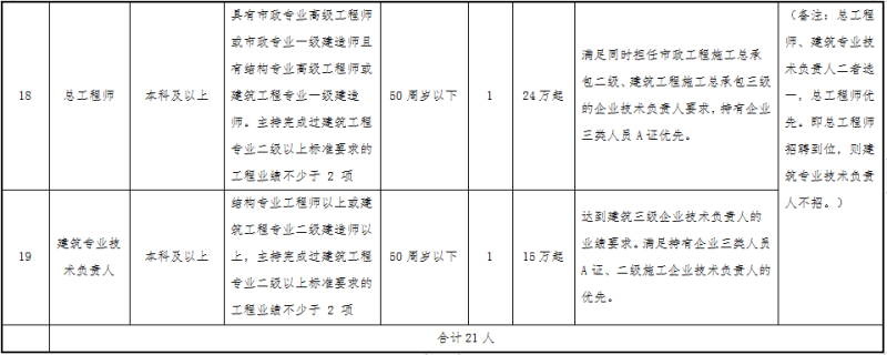 本次面向社会公开招聘衢州市城市建设投资集团有限公司及下属子公司国有企业工作人员共21人。具体招聘岗位、岗位(专业)人数及其他条件要求详见附表一。