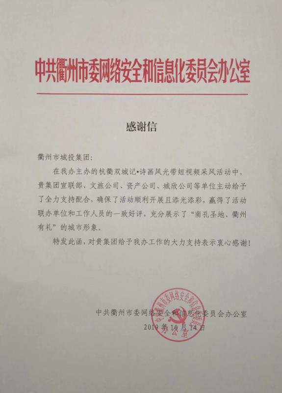 近日,中共衢州市委网络安全和信息化委员办公室向集团发来感谢信,感谢集团宣联部、文旅公司、资产公司、城欣公司等单位在杭衢双城记·诗画风光带短视频中,主动给予了全力支持配合,确保了活动顺利开展且添光添彩,赢得了活动联办单位和工作人员的一致好评,充分展示了“南孔圣地、衢州有礼”的城市形象。