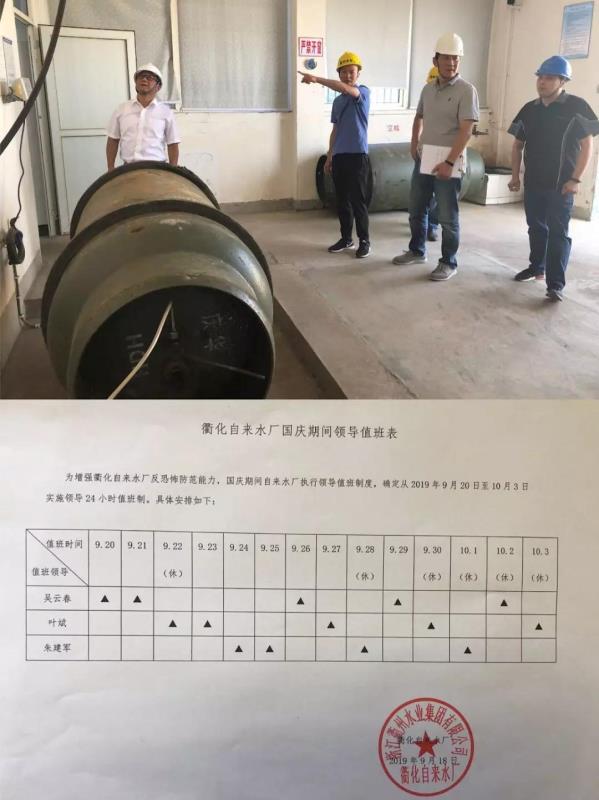 19日,检查组继续开展综合检查。在衢化自来水厂,重点对消防设施设备、消防台账、安防措施进行了检查,实地查看了中控室、加氯间、反应沉淀池,详细了解了国庆期间值班安排等情况。