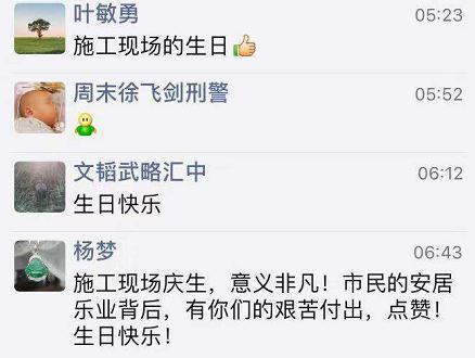 “施工现场庆生,意义非凡!市民安居乐业的背后,有你们的辛苦付出,点赞!”微信圈网友“杨梦”留言道。