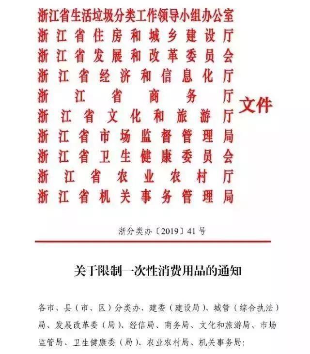 11月1日,浙江省生活垃圾分类工作领导小组办公室等十个部门联合发布通知,自2019年12月31日起,浙江党政机关不得使用一次性杯具,单位内部办公场所、会议室接待统一使用陶瓷杯或玻璃杯,倡导干部职工办公或开会自带水杯。