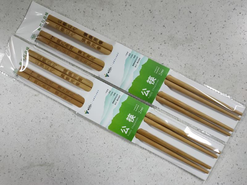 公筷长30cm,材质以鸡翅木和毛竹为主,公筷粗端还雕刻印制了“衢州有礼”品牌logo和“公筷公勺 健康用餐”字样。