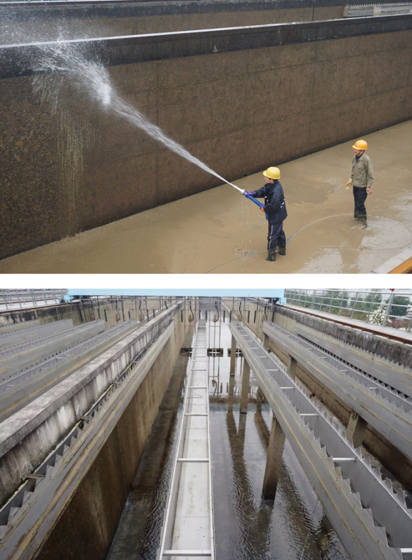 经过7个小时的努力,斑驳不平的池壁“原形毕露”,泥泞的池底也“桑田变沧海”露出平整洁净的真面目。维修小组也完成了水下设备的检查维护,维修了搅拌桨底座的轴承及吸泥行车的吸泥泵。一切确认无误后,清洗后的反应沉淀池逐步进水恢复运行。