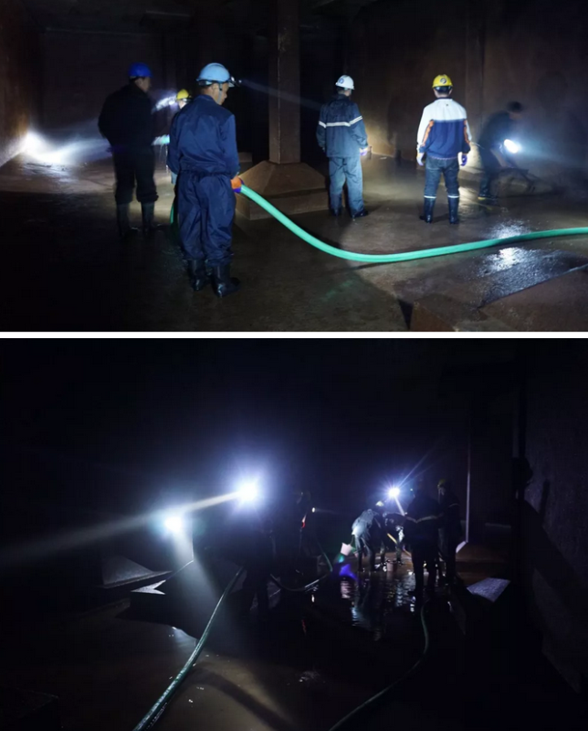 随后,水厂又分八次对剩余的反应沉淀池、清水池及泵房集水井进行进行清洗及检查维护。随着洗池持续进行,员工的体力消耗力较大,后阶段的清洗工作越来越艰巨。特别是在清水池清洗过程中,排水泵的钢丝软管约有30多米,每次搬动都需要十多人配合;为保证供水安全,每次清水池切换及降液位,都需要领导带队,三个阀门操作小组和中控值班员密切配合,掐着时间和液位,对水泵机组和阀门进行切换操作;另外三千四百多平方米的地下清水池,廊道迂回曲折,幽湿黑暗,且无手机信号,所以洗池时,几乎绝大部分员工都要“失联”七八个小时。