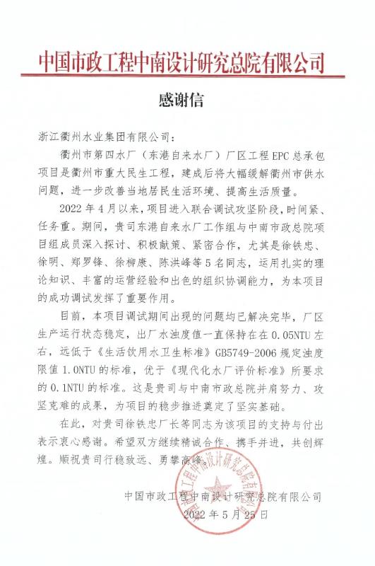近日,市城投水业集团收到一封中国市政工程中南设计总院有限公司发来的感谢信。信中,中国市政工程中南设计总院对市城投水业集团东港自来水厂工作组在项目联合调试阶段积极献策、紧密合作,为项目成功调试所发挥的重要作用表示了感谢。