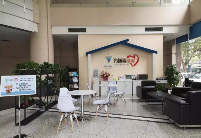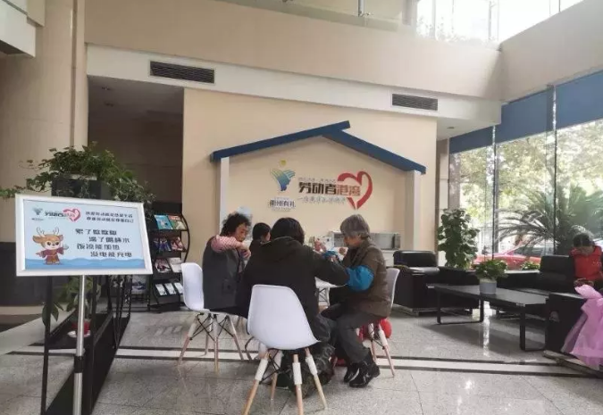 沙发桌椅、微波炉、充电器、饮水机、雨伞、轮椅、报刊杂志、鲜花绿植等应有尽有,处处彰显着关爱劳动者的温暖。