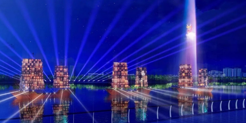 光影秀的主角为3艘帆船,每艘船上安装两块LED柔性大屏幕,配备喷火装置、雾森系统、声光电设备等,屏幕总面积超过500平方米。